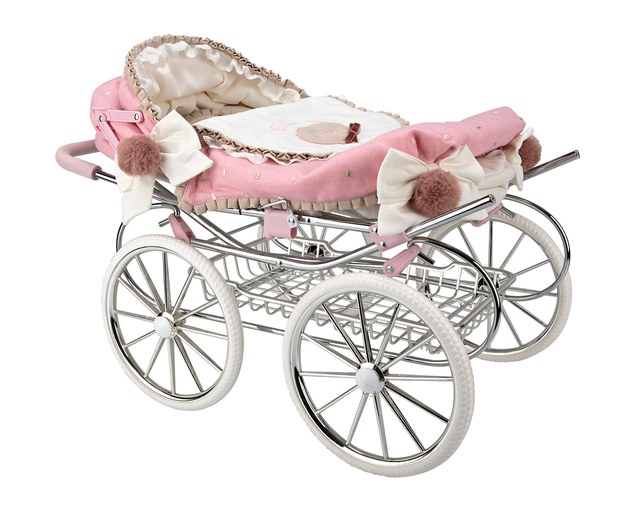 This classic pink pram with hood is ideal for enjoying long afternoon walks all around the city. Made from high-quality materials and fabrics that guarantee the product will last for a long time.