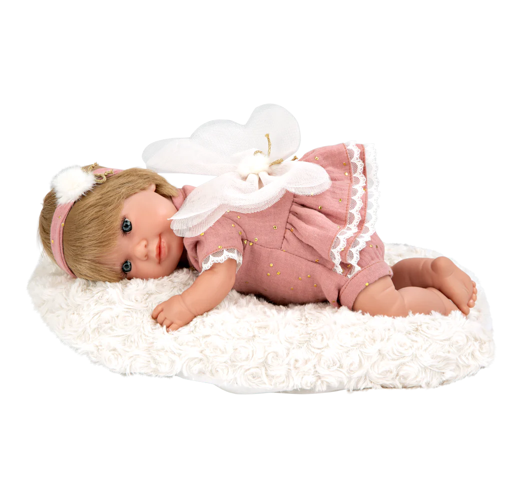 ELEGANCE 35 cm SORA doll with soft body and vinyl limbs, dressed in neutral pink tones with butterfly wings. Includes cushion and dummy.
