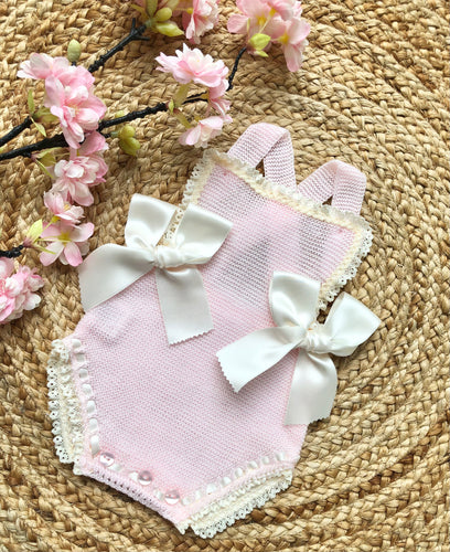 Baby Girls Pink Spanish Knitted Romper with Bows